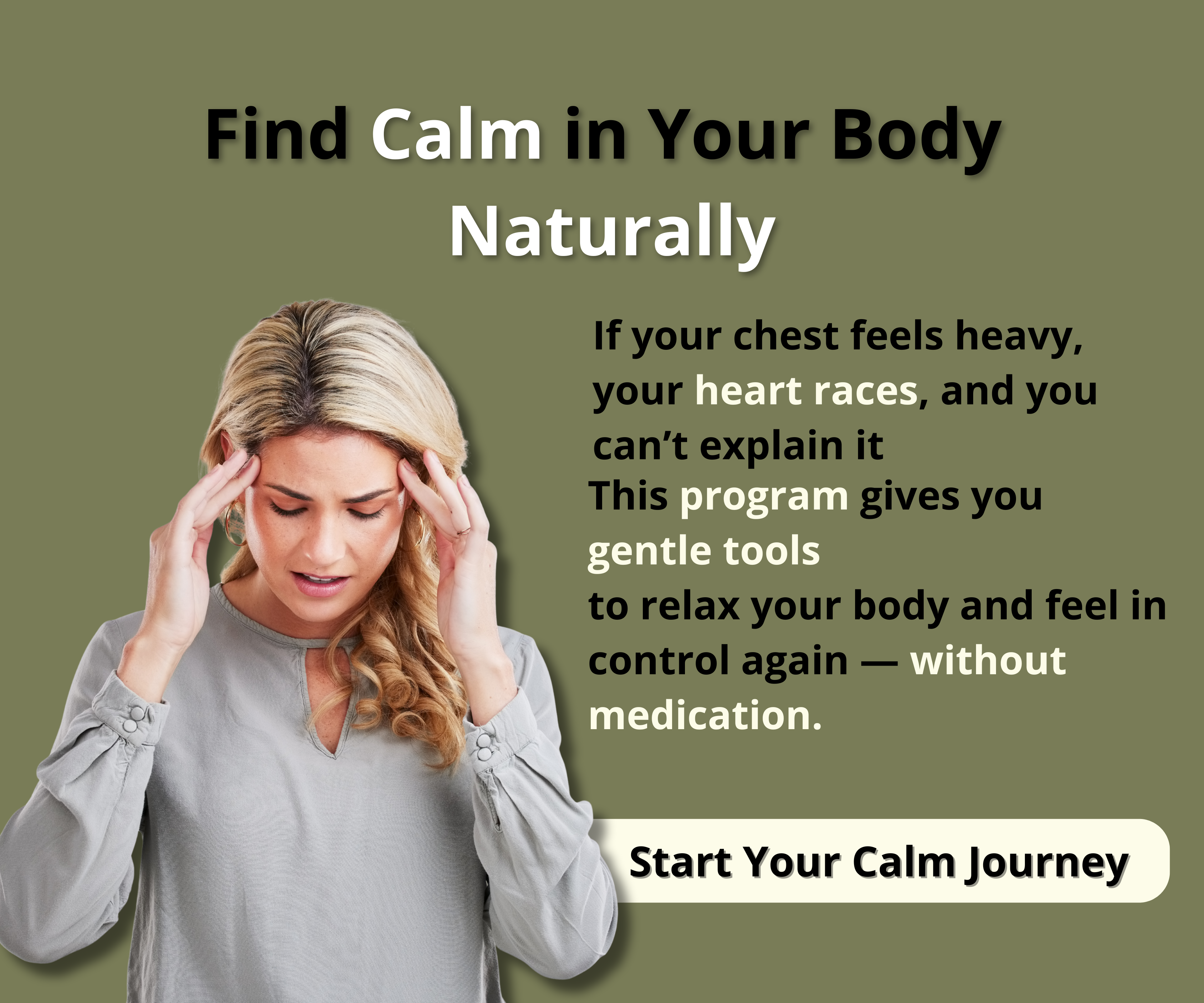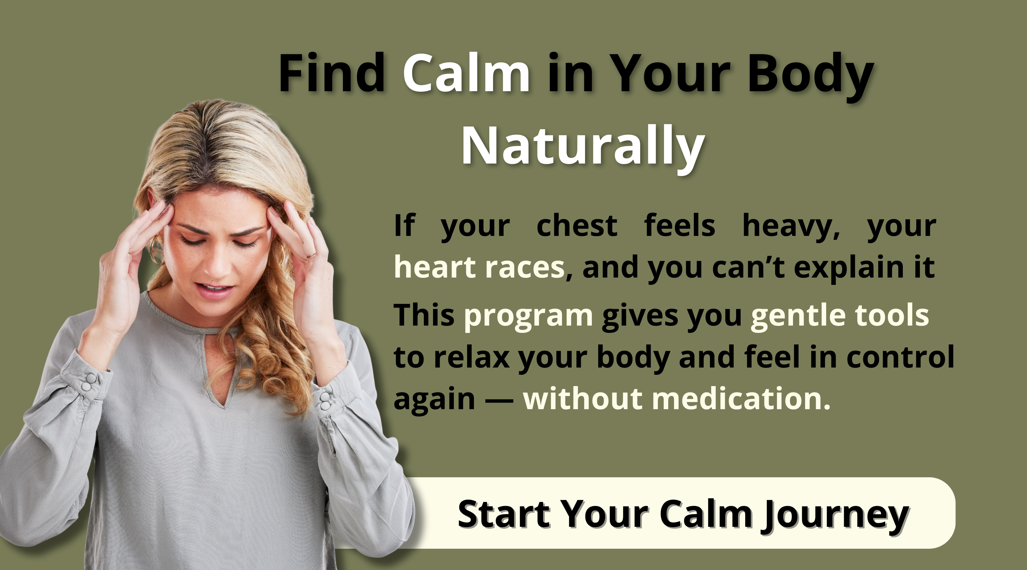 Discover how to calm your body and ease anxiety naturally with our step-by-step digital program. Feel safe, grounded, and in control again — in just a few minutes a day.